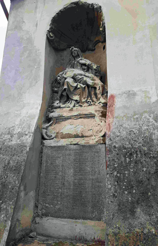 Dies müsste dringend saniert werden. Unter der Pieta ist eine abgeplatzte verzierte Fläche auf der wahrscheinlich die Widmung stand,