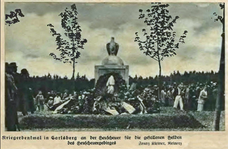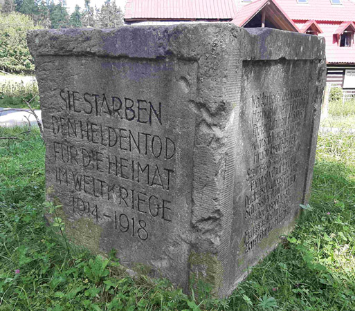 Reste eines Denkmals für Gefallenen des 1. Weltkriegs aus der Gemeinde Karlsberg und für Waldarbeiter aus der Gegend.