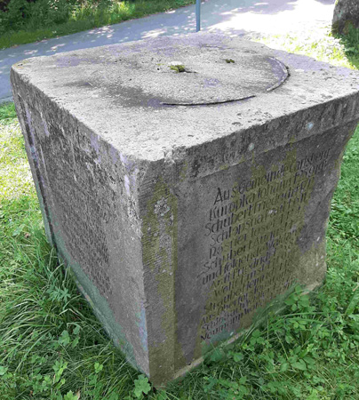 Quader mit Inschriften an allen vier Seiten, oben runder Ansatz einer ehemaligen Säule.