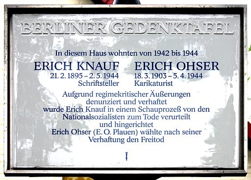 Gedenktafel für den Karikaturisten Erich Ohser (Pseudonym e. o. plauen) und den Schriftsteller Erich Knauf in Berlin-Kaulsdorf am Haus Am Feldberg 3.
