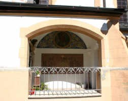 Offener Anbau an der Kirche, mit Kruzifix, Gemälde im Bogenabschluss, darunter Gedenktafel mit österreichischem Doppeladler.