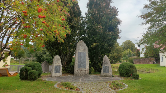 Dreiteiliges Kriegerdenkmal für beide Weltkriege in einem kleinen Park.
