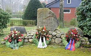Steinwall mit drei Findlingen. Die Inschriften sind zum Teil nicht mehr lesbar.