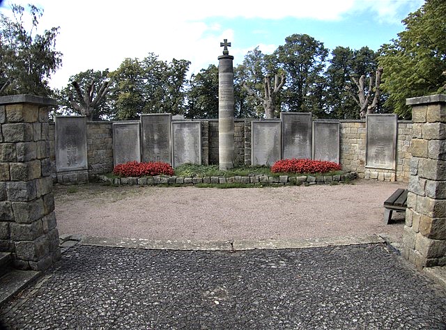 An der Mauer innen die Namenstafeln. Den ursprünglich acht steinernen Namenstafeln des Ersten Weltkriegs wurden nach dem Zweiten Weltkrieg acht weitere hinzugefügt.