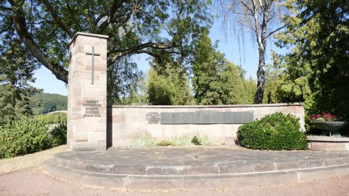 Aus Natursteinen gemauerte, rechteckige Säule mit angefügter Wand, an der Gedenkplatten angebracht sind.