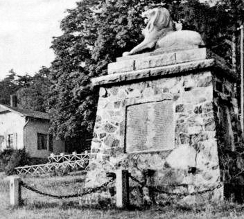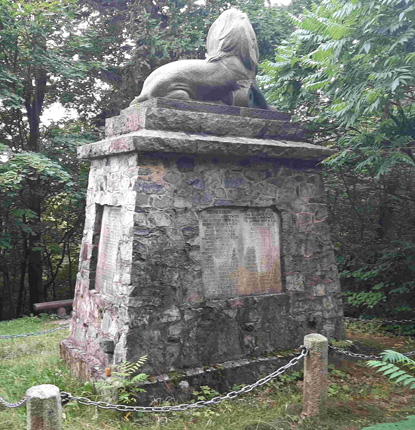 Namenstafeln und krönender Figur eines ruhenden, brüllenden Löwen.