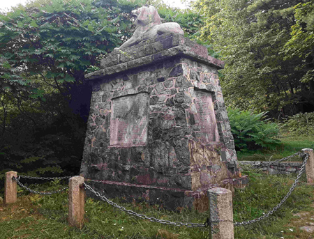 auf dem Hügel hinter der Kirche, nördlich von Költschen. Hoher Quader mit eingelassenen Widmungs- und