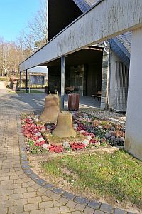 An der Aussenwand der Aussegnungshalle sind vier Gedenkplatten angebracht.