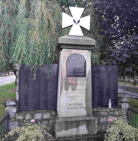 sowie des II. Weltkrieges an der Dorfstraße. Abgestufte Stele mit krönendem EK-Zeichen.
