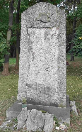 Die eingelassene Widmungs- und Namenstafel wurde nach 1945 zerschlagen, nur die leere Vertiefung zeugt noch davon.