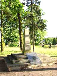 Auf dem Friedhof von Kraak: Ein Obelisk mit den Namen der Opfer des Ersten Weltkriegs auf einem dreistufigen Podest, oben ein Kreuz.