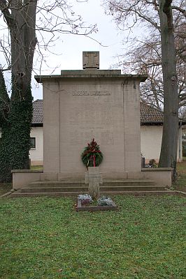 Kriegerdenkmal einem großen Grab ähnelnd. Gedenkplatte von zwei Säulen gestützt. Oben ein Deutsches Kreuz.