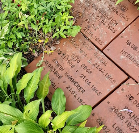 Kriegsgräberstätte auf dem Neuen Friedhof. Die Grabplatten sind vor dem Kreuz in zwei Reihen angelegt.
