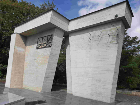 niedrigen Mauer umschlossen wird. Oben befindet sich ein großes Mahnmal, bestehend aus zwei versetzten,