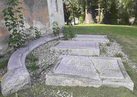 Drei (von ehemals vier) Namensteinen sind hinter der Kirche flach auf dem Boden abgelegt. Ganz in der Nähe steht noch das