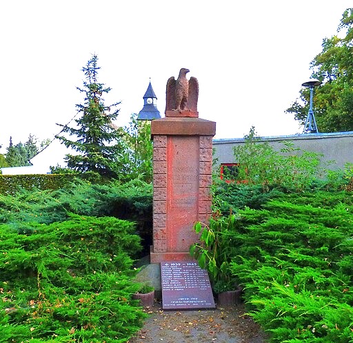 Aus Sandsteinelementen gemauerte Stele auf der ein Adler sitzt. An den Seiten sind die Namen der Gefallenen des Ersten Weltkriegs vermerkt.