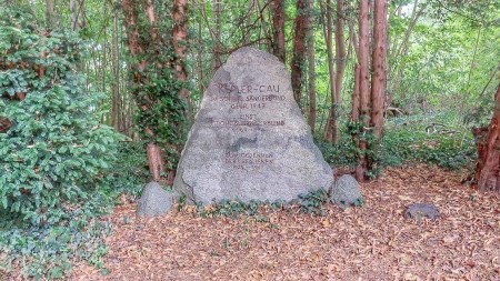 In einen nach oben konisch zulaufenden Granitstein (ca. 1,0 m breit und 1,5 m hoch) ist die Inschrift eingearbeitet.