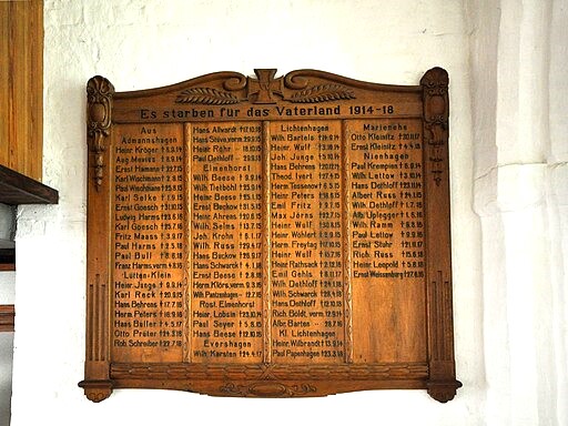 Holztafel mit den Gefallenen des Ersten Weltkriegs in der Dorfkirche Lichtenhagen unter der Empore.