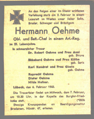 EK 2; Vater: Oblt. d. Res. Robert Sch., Lübeck Hansestr. 29/I. |