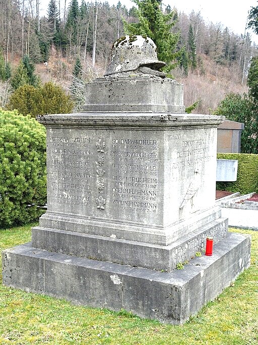 Im Friedhof Friedental, Grabfeld 9, ein quadratisches Denkmal, oben mit gemeißeltem Stahlhelm,