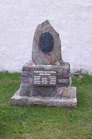 Gedenkstein mit zwei Tafeln vor der Kirche.