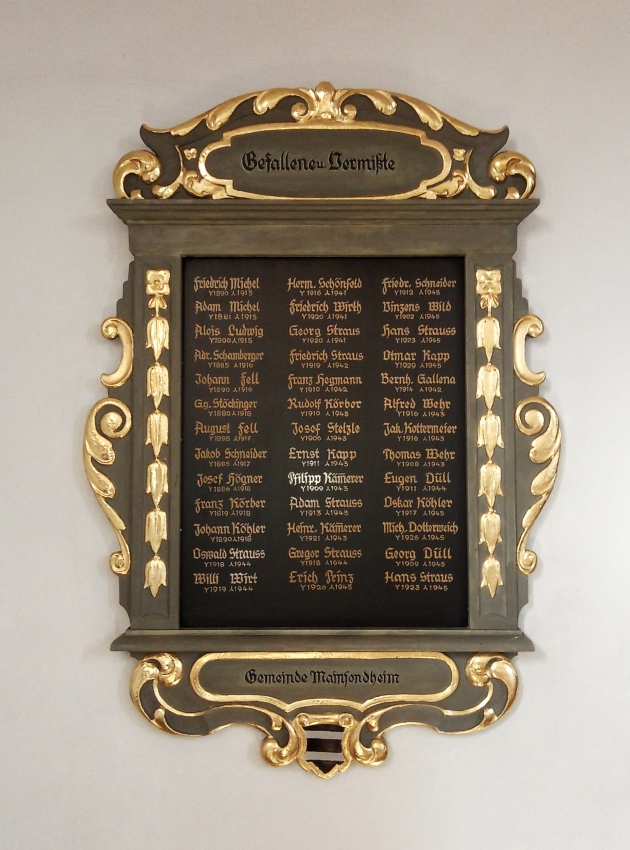 Reich verzierte Gedenktafel mit den Gefallenen und Vermissten beider Weltkriege in der Kirche.