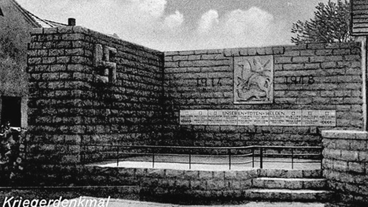 Ehemaliges Denkmal für die Gefallenen des 1. Weltkriegs. Aus Natursteinen gemauerte abgewinkelte Wand.