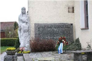 Gedenkwand an der kath. Kirche, daneben Steinplastik.
