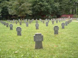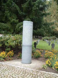 Eine Rundstele mit den Namen der unter den Unbekannten in Einzelgräbern ruhenden Gefallenen und eines von mehreren Grabfeldern mit Steinkreuzen.