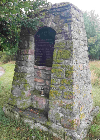 Aus Feldsteinen gemauerte stumpfe Pyramide mit Vertiefung in der Mitte in die eine Widmungs- und Namenstafel eingelassen ist.