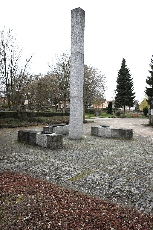 Graue Granitsäule neben der Leichenhalle auf dem städtischen Friedhof. Inschrift aus Bronze auf den liegenden Quadern.