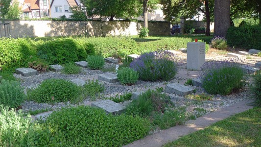 Einzelgräber mit liegenden Grabsteinen für die zu beiden Seiten einer quaderförmigen Gedenksäule bestatteten Gefallenen des Ersten und des Zweiten Weltkrieges.