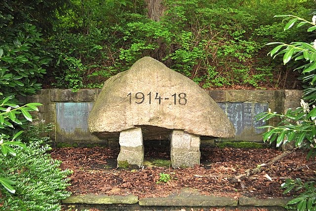 Findling zum Gedenken der Opfer des Ersten Weltkriegs, dahinter in eine Feldsteinmauer