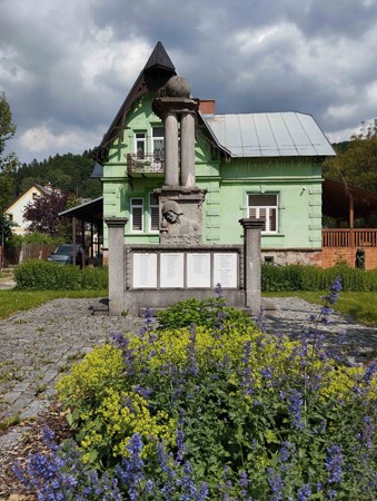 Denkmal in Ortsmitte: Soldat mit Stahlhelm über den Jahreszahlen 1914-1918, darunter 4 Tafeln mit Namen aus verschiedenen Ortschaften