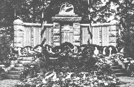 Darauf eine halbrunde Wand mit erhöhtem Mittelteil, das ein Adler krönt. In der Mitte befindet sich ein großes Kreuz mit Stahlhelm und