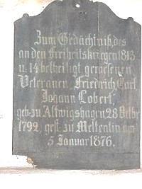LOBERT | Carl Friedrich Carl Johann | 28.10.1792 Altwigshagen | 05.01.1876 | Zum Gedächtnis des an den Freiheitskriegen 1813 u. 14 betheiligt gewesenen Veteranen |