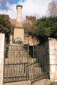 Die Sandsteinsäule zum Gedenken des Krieges 1870/71 steht leicht erhöht am Aufweg zur Kirche