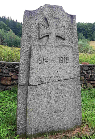 Denkmal für die Gefallenen des 1. Weltkriegs am Rande des Kirchhofs. Aufgerichtete Granitplatte mit herausgearbeitetem