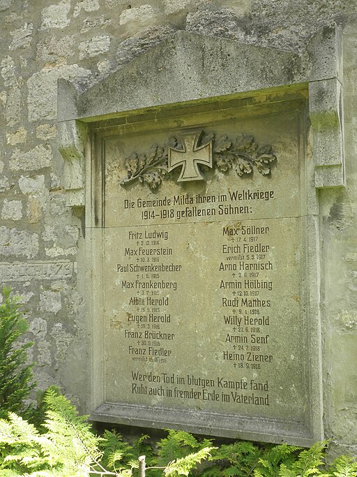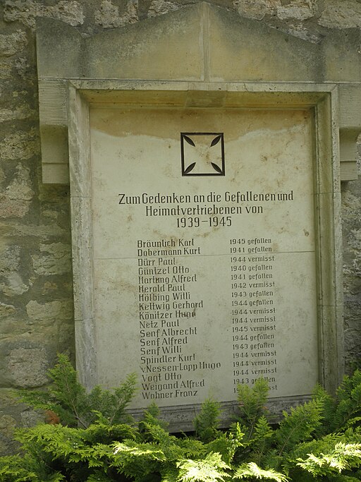 Auf beiden Seiten des Kircheingangs der ev. Kirche St. Jakobus sind Gedenktafeln mit den Namen der in einem der beiden Weltkriege gefallenen und vermissten Soldaten eingelassen. Die Tafeln sind aus Sandstein gearbeitet. Ihre Fassung lehnt sich an ein Fenster an. Der Abschluss der linken Tafel nach oben zeigt ein Eisernes Kreuz auf einem Zweig Eichenlaub. Darunter folgen die Inschrift und die Namen der Opfer des Ersten Weltkrieges. Die Tafel für die Opfer des Zweiten Weltkrieges ist an die Gestaltung der anderen Tafel angelehnt, jedoch nicht so gelungen. Sie erinnert an eine flache Kiste (Sarg der Geschichte?), hat oben ein Eisernes Kreuz, das etwas in seiner Mitte trug (Hakenkreuz ?).