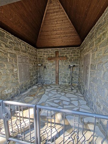 Offene Gedenkkapelle, darin ein Holzkreuz, zwei Feuerschalen und an den Seiten zwei Gedenkplatten.