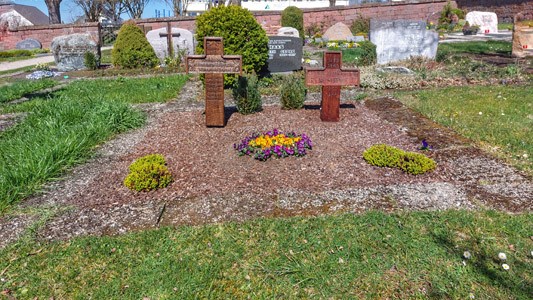 Auf einer kleinen gepflegten Kriegsgräberstätte bestehend aus zwei Kreuzen auf dem Möttlinger Friedhof sind drei Opfer des Zweiten Weltkriegs beigesetzt.