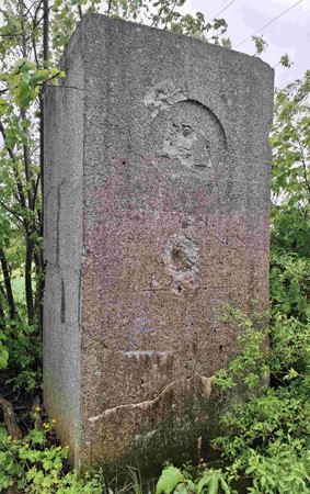 Auf dem Denkmal befinden sich vorn Einschusslöcher, es bröckelt stark und es ist mit Büschen zugewuchert.