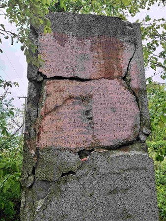 Die Rückseite mit den eingravierten Namen bröckelt sehr stark und Teile von Namen