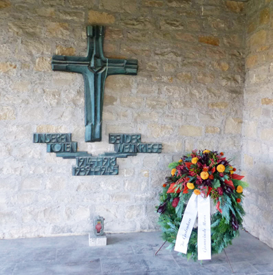 Gedenken an beide Weltkriege an der Aussegnungshalle des Friedhofs.