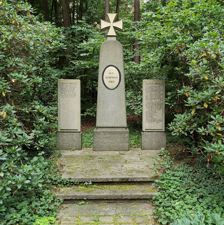 Restauriertes Denkmal mit krönendem Tatzenkreuz neben der Bürgerhalle.