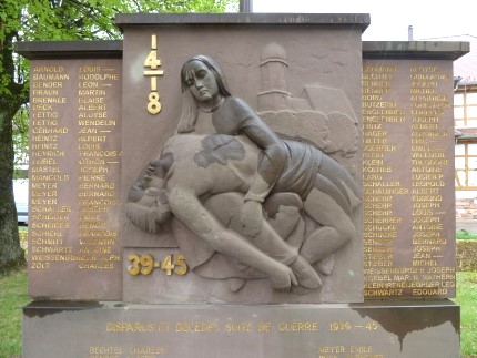Modern gehaltenes Kriegerdenkmal mit der Piètadarstellung und den Namen der Kriegstoten.
