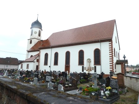 Vier Tafeln mit den Namen der Kriegstoten an der Außenseite der katholischen Kirche Notre Dame de la Visitation, die vom Friedhof umgeben ist.