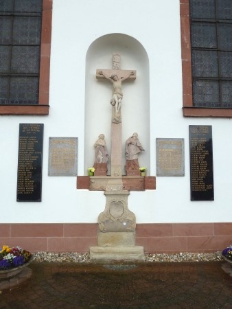 Die Tafeln sind links und rechts einer plastischen Darstellung der Kreuzigungsszene angeordnet, je zwei für die Toten des Ersten und des Zweiten Weltkriegs.