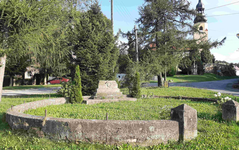nördlich der Kirche. Die runde Einfriedung und der mehrstufige Sockel mit dem Relief eines Ehrenkranzes sind erhalten.