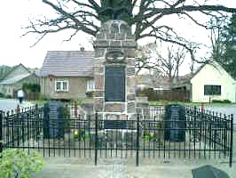 Kurz nach dem Ortseingang, an der ersten Gabelung der Dorfstraße vor zwei hintereinanderstehenden großen Eichen eine mit einem eisernen Zaun umgebenen Stele